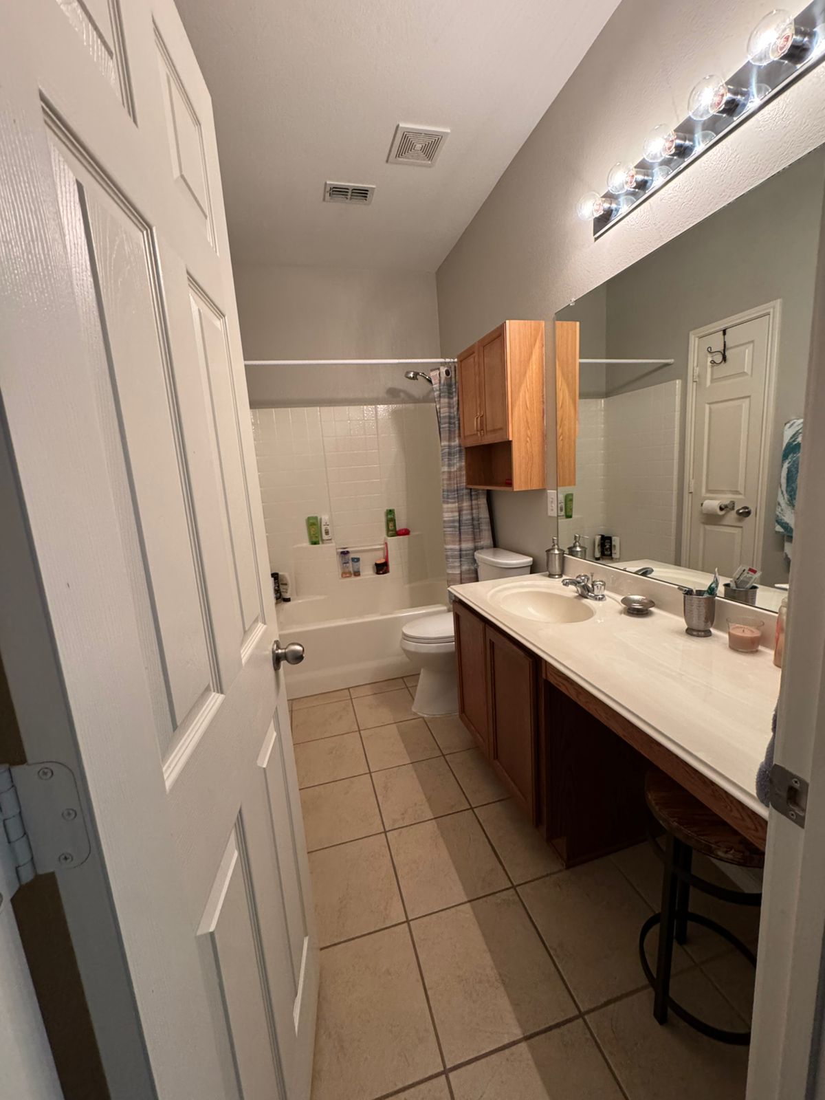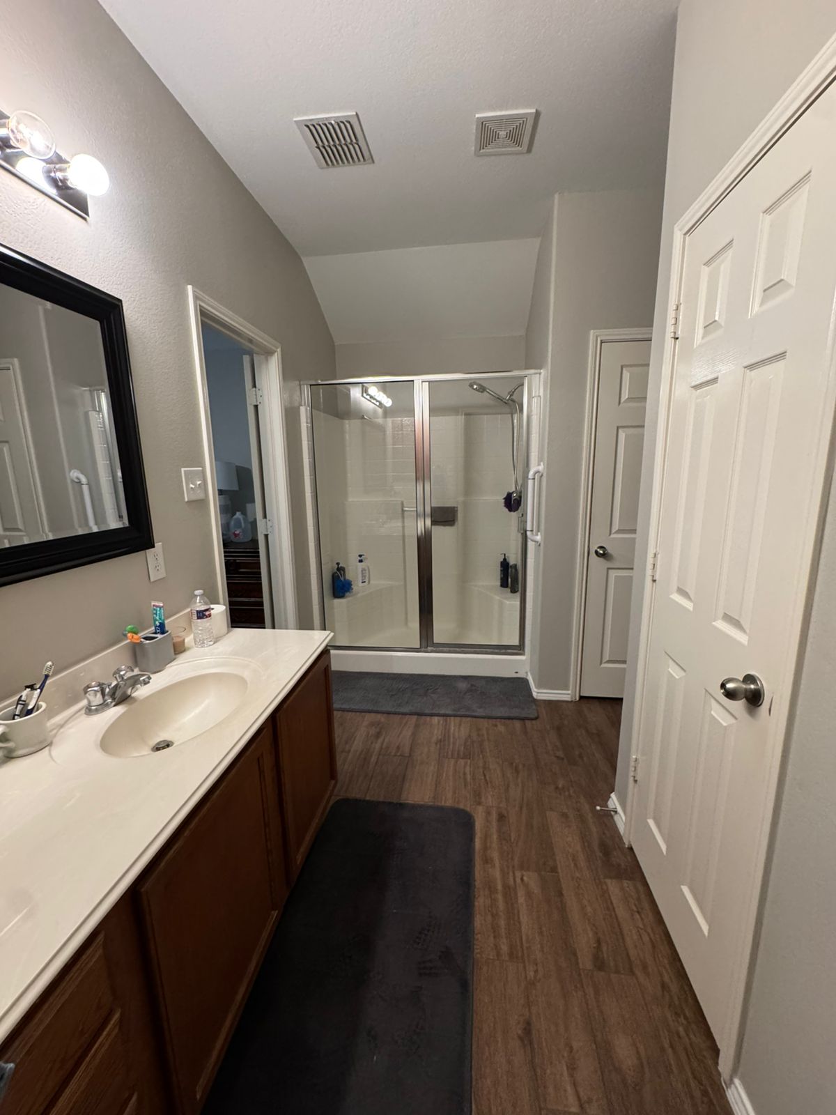 We introduced a neutral palette with crisp white tiles, warm wood tones, and brushed nickel fixtures to create a calm, spa-like feel. A sleek new vanity, frameless glass shower, and built-in storage added both beauty and practicality. The lighting was upgraded to enhance visibility and ambiance, making the entire room feel more spacious and inviting.